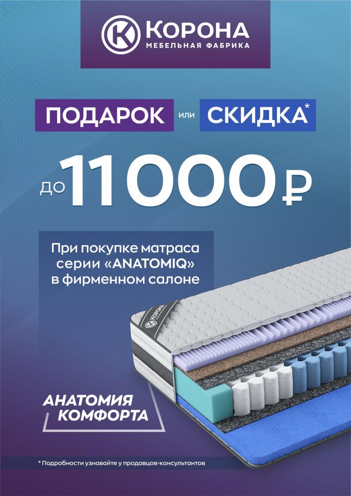 При покупке матраса из серии «Anatomiq» действует акция: подарки до 11 000 р. или скидка на следующий товар ТМ «Корона» в этом же чеке с 01.07.2025 - 30.11.2025г.